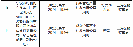 12月24日金融一线音信,国度金融监督处置总局上海监管局行政处罚信息公开表清爽,宁波银行股份有限公司上海宝山支行因贷款处置严重违犯审慎议论程序,被罚金20万元。刘俊(时任宁波银行股份有限公司上海宝山支行零卖公司二部总司理助理、副总司理)受到劝诫。