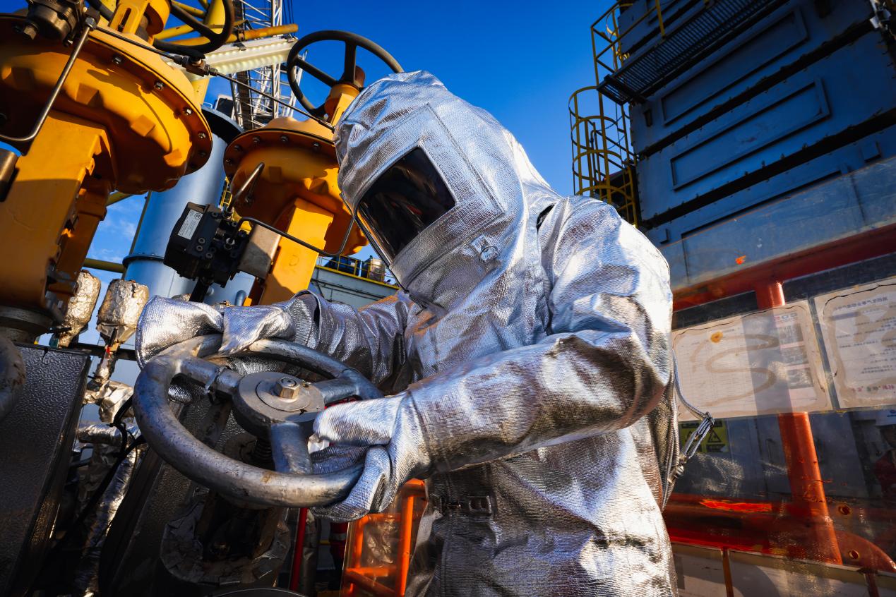 稠油热采油田注热历程中,分娩东谈主员身穿隔热服进行操作。(中国海油供图)