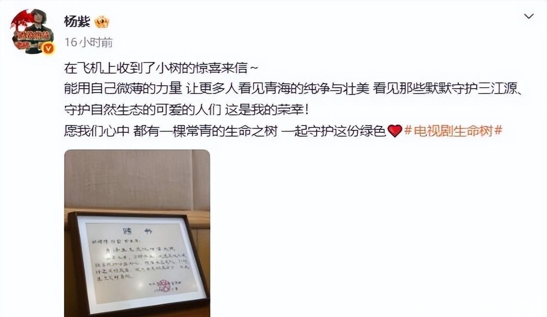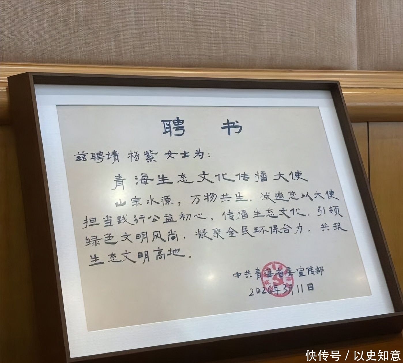 会上,杨紫与演员胡歌共同被授予“青海生态文化传播大使”名称,成为该职务首批获任者之一。