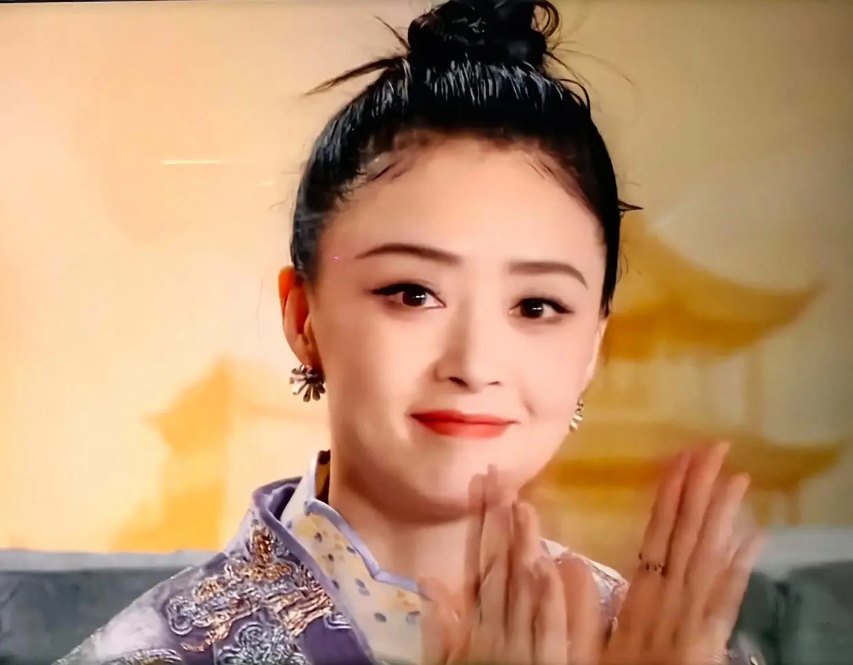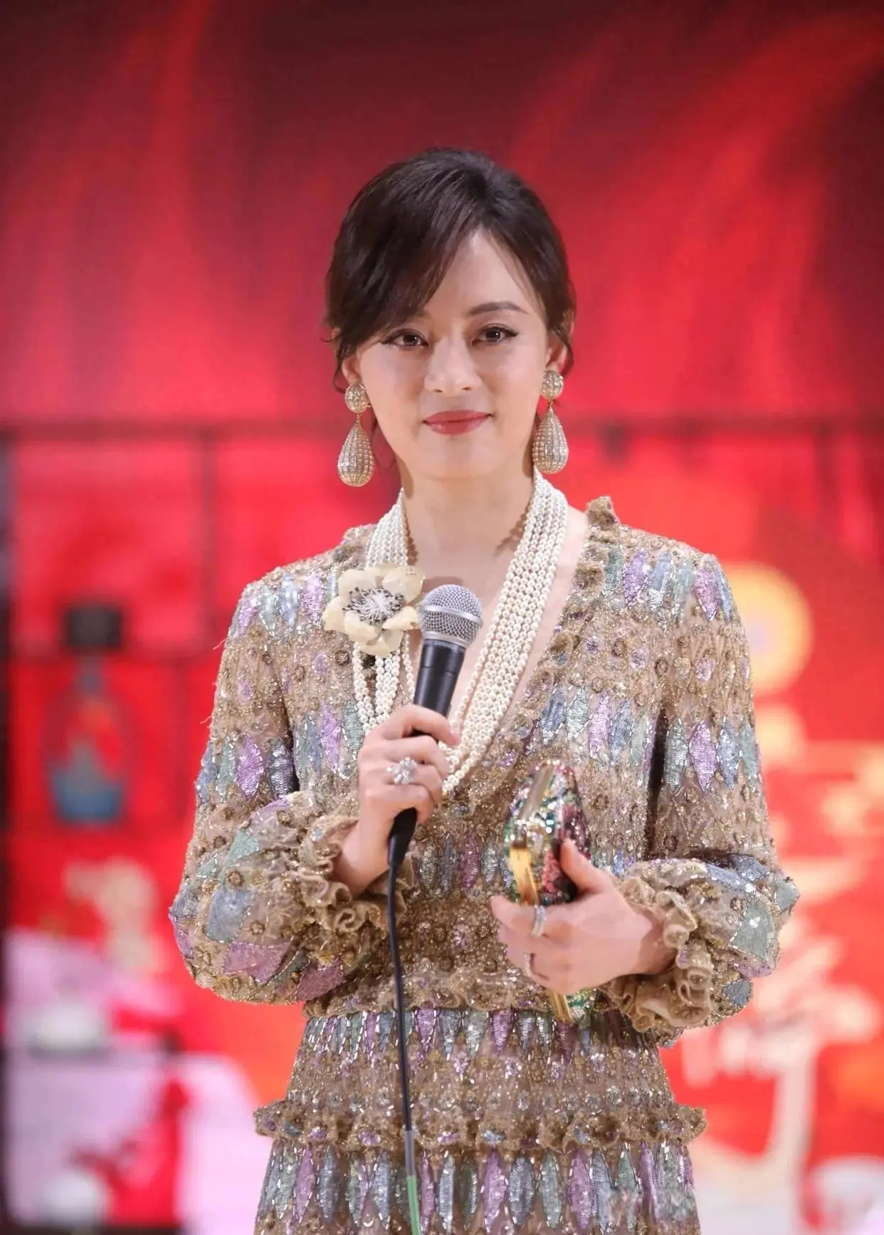 甄嬛的饰演者孙俪,全身闪耀着钉珠和珍珠叠戴项链,夸张的大耳钉。
