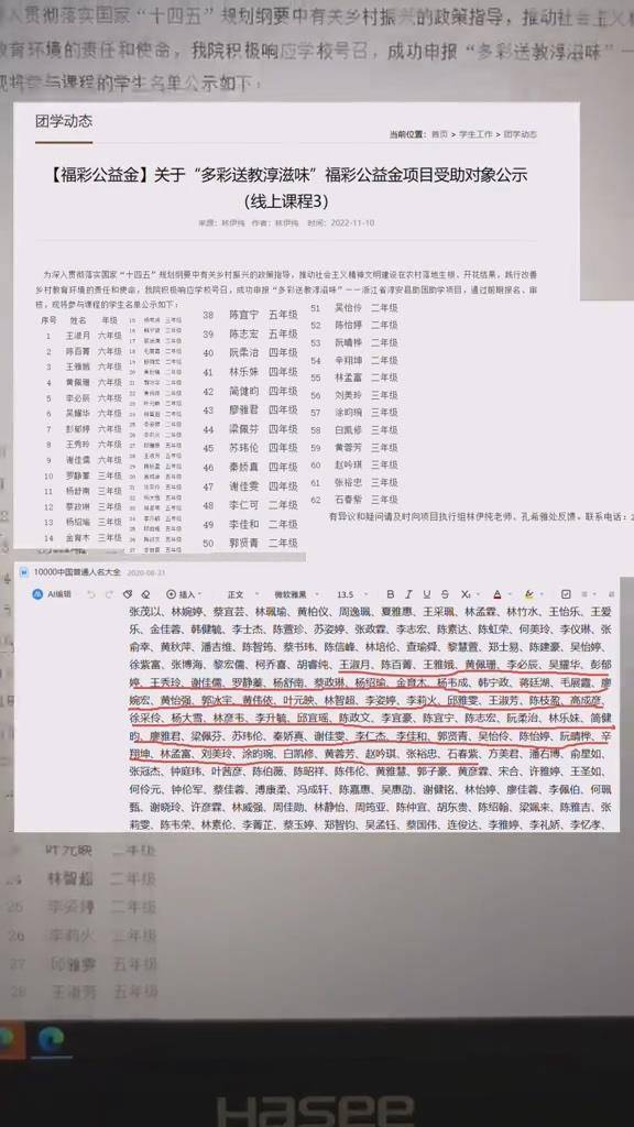 该网友发布视频称,其发现杭州师范大学东谈主文体院官网2022年11月公示的一份“福彩公益金步地受助对象”名单中,所使用的姓名来自2020年发布的百度文库10000个东谈主名大全,姓名和蔼序一模相通。该网友还发现,该学院官网公示的其他“福彩公益金步地受助对象”名单中,也存在宽绰使用上述东谈主名大全名录中姓名的情况。质疑存在演叨的问题。