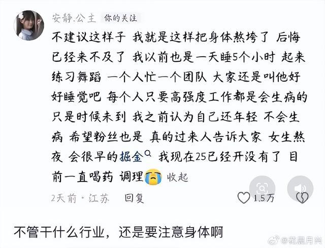 “体魄垮了是一辈子的事。”她在直播中向粉丝,尤其是女性群体发出千里重号召,强调必须优先保证寝息和章程饮食。这番自曝速即激勉海量共识,驳斥区成了“病友”共享会:“25岁停经”、“永久熬夜确诊卵巢早衰”等案例百花齐放,一场对于年青东谈主健康“债务”的集体反念念被顷刻间燃烧。