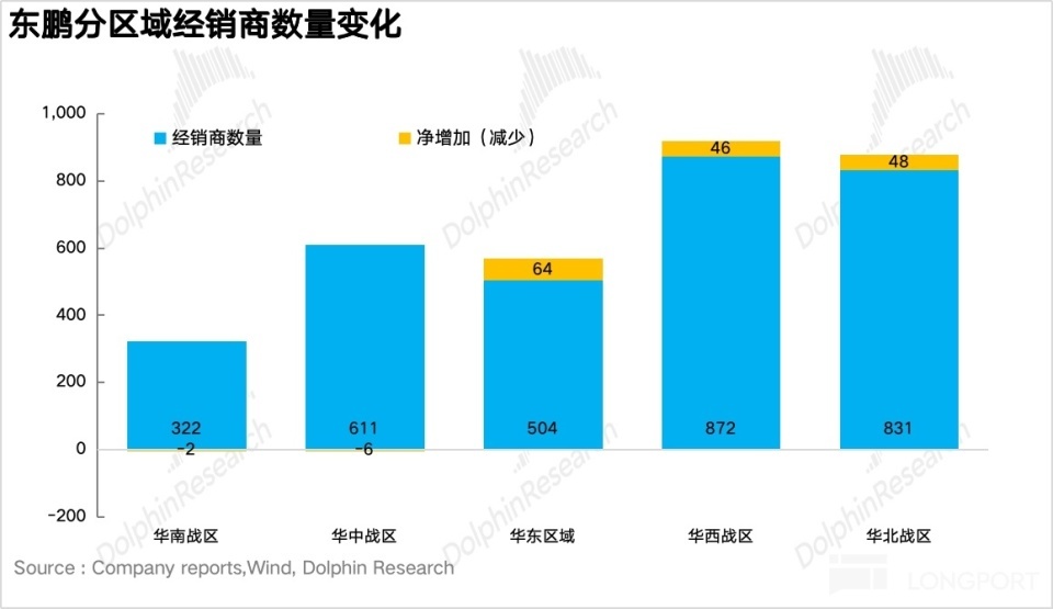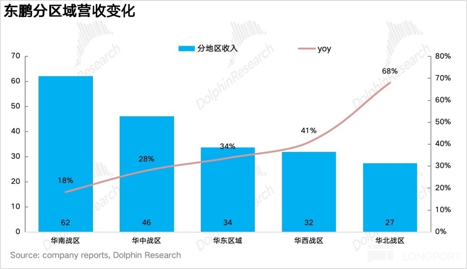 分区域来看,由于公司变更了露出口径(大本营广东并入了华南战区),但海豚君皆集调研信息揣摸,两广地区在网点尽头造就的情况下只须低个位数的增长,而华北(京津冀、鲁豫)和华西(川渝、西北)战区由于网点密度远低于南边,仍处于浸透率快速普及阶段。