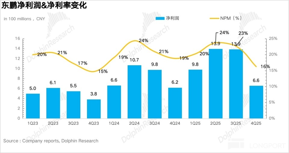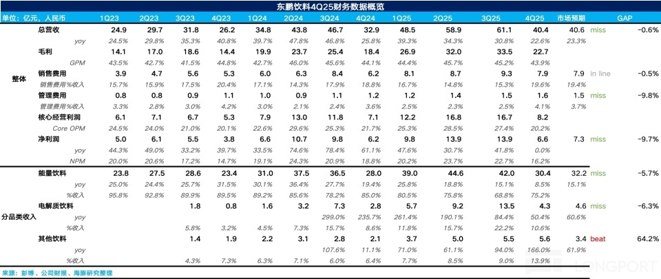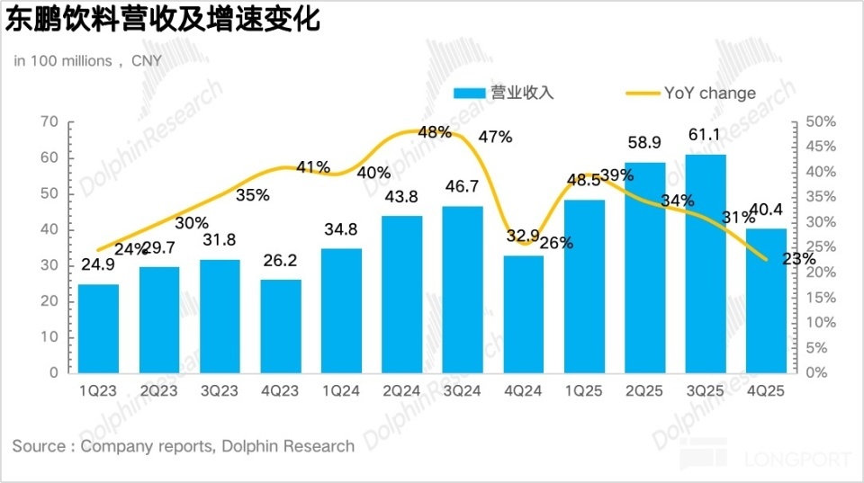 4Q25 东鹏饮料兑现营收 40.4 亿元,同比增长 22.6%,从趋势上看资格了从一季度运转衔接的换挡放慢,中枢原因如故海豚君约束强调的东鹏正处于特饮面对增长瓶颈而 “第二弧线” 由于低基数原因填补不了特饮增速下滑的 “青黄不接” 阶段。