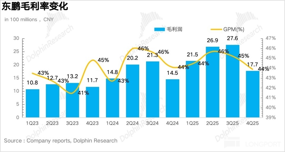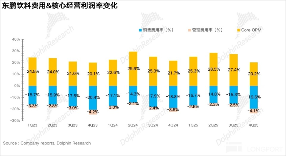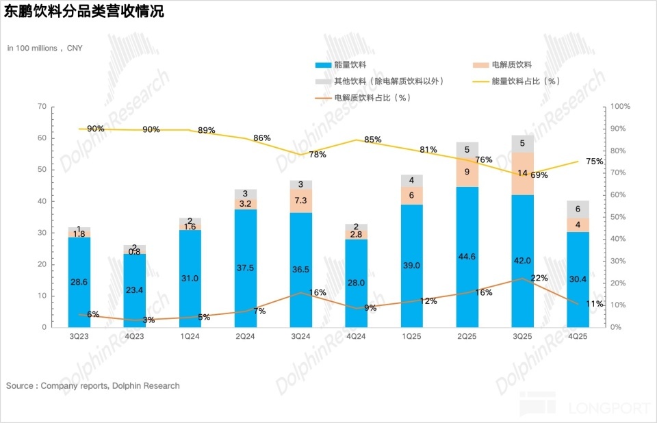 拆分品类看,4Q25 能量饮料兑现营收 30.4 亿元,同比增长 8.5%,单季度增速进一步新低,除了天然增长放缓外,海豚君揣摸也和四季度公司组织架构调整、里面团队处于磨合期,东鹏主动放缓了发货节律联系。