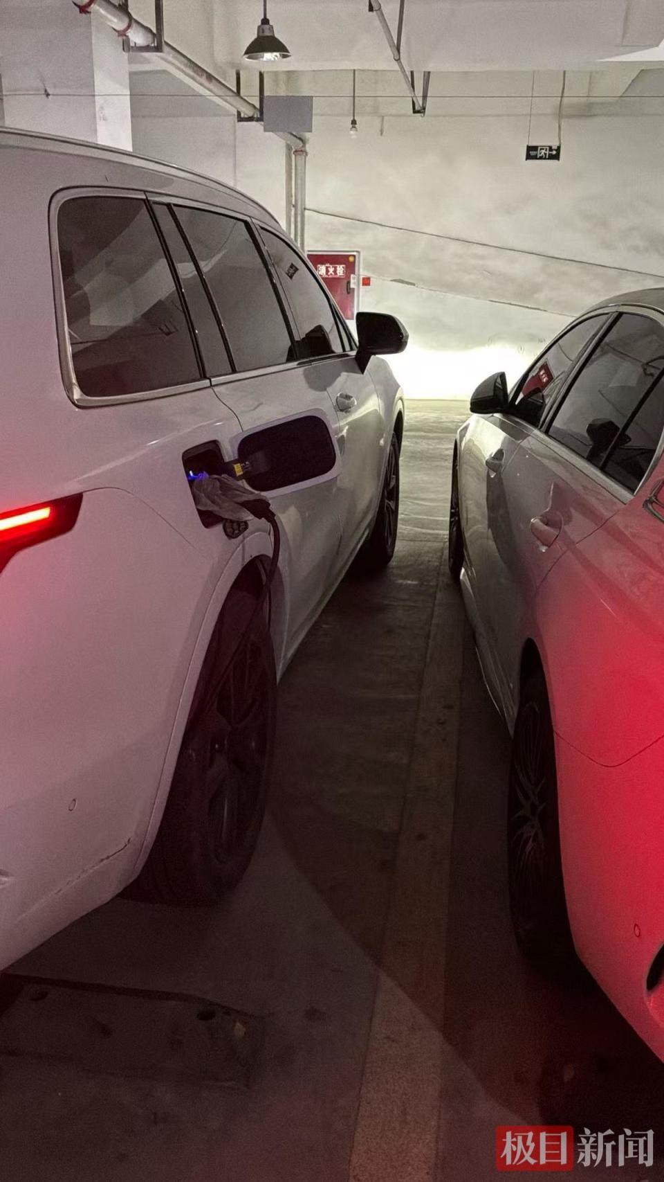 王先生的车(右)停在泊车位上无法开关车门(受访者供图)